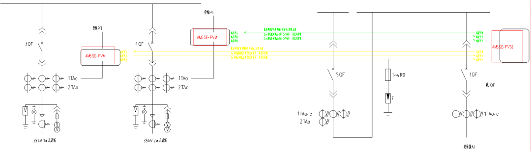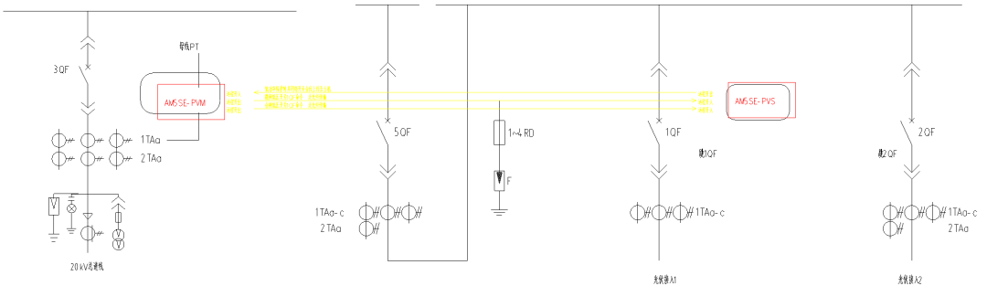 當市電進線為多路電源進線帶1或多個并網點,主機選用AM5SE-PVM、從機選用AM5SE-PVS2(1個主機*多支持5個從機、1個從機*多接受4個主機),如圖所示。
