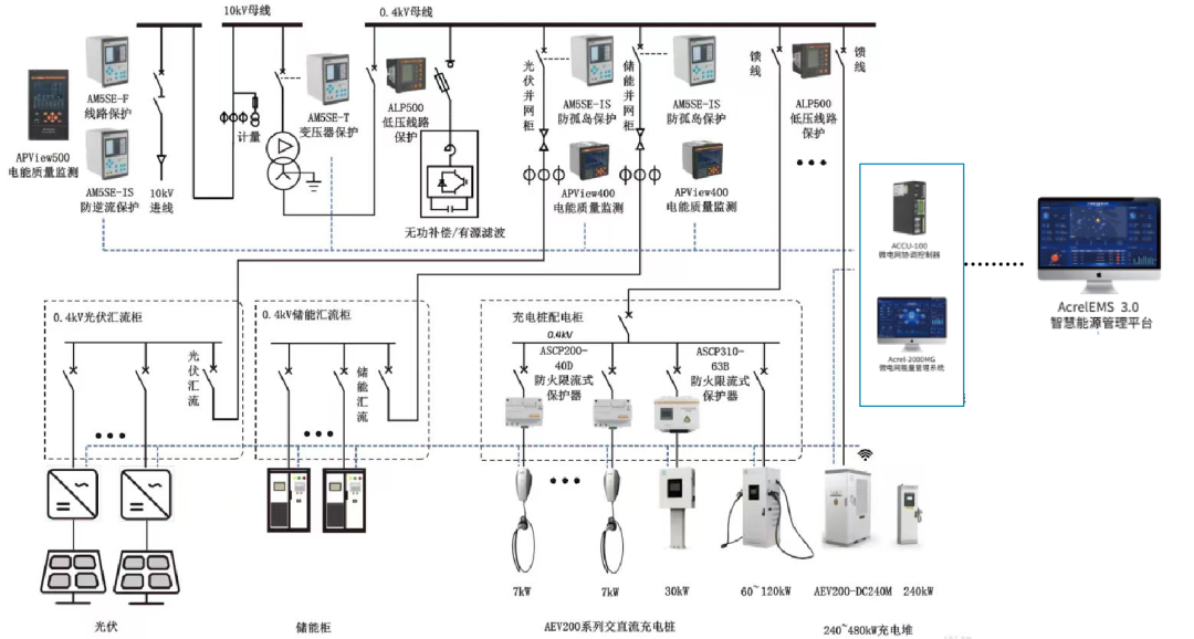 借助 AcrelEMS 3.0智慧能源管理平臺,可對用戶微電網的光伏發電系統以及用電負荷展開實時監測。結合先進的光伏預測技術,該平臺能夠優化運行策略,實現源荷之間的有序互動。不僅可以靈活調節逆變器出力,有效避免逆流現象,還能充分滿足企業微電網在能效管理數字化、安全分析智能化等方面的需求,顯著提高微電網的運行效率和能源利用率。